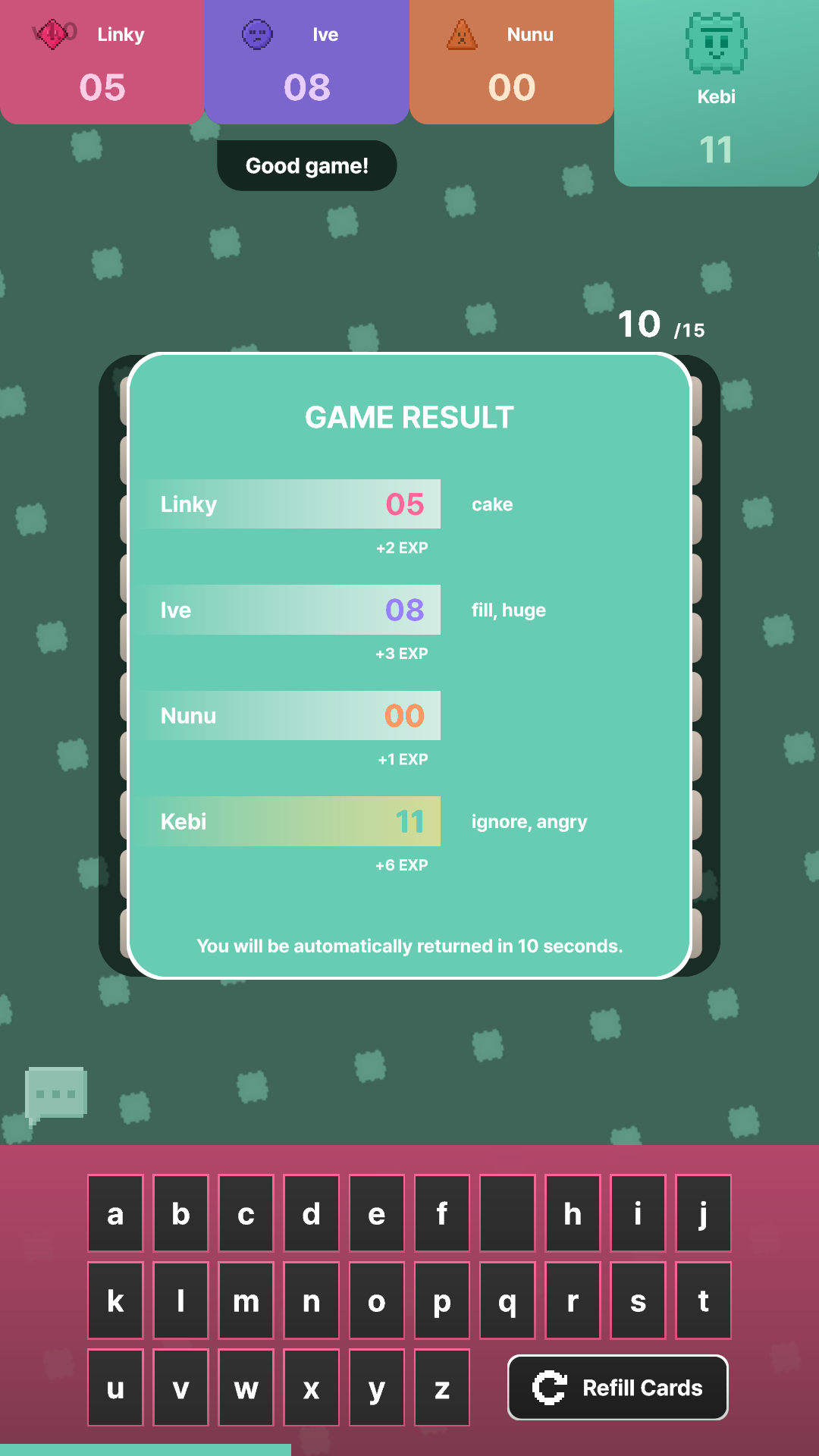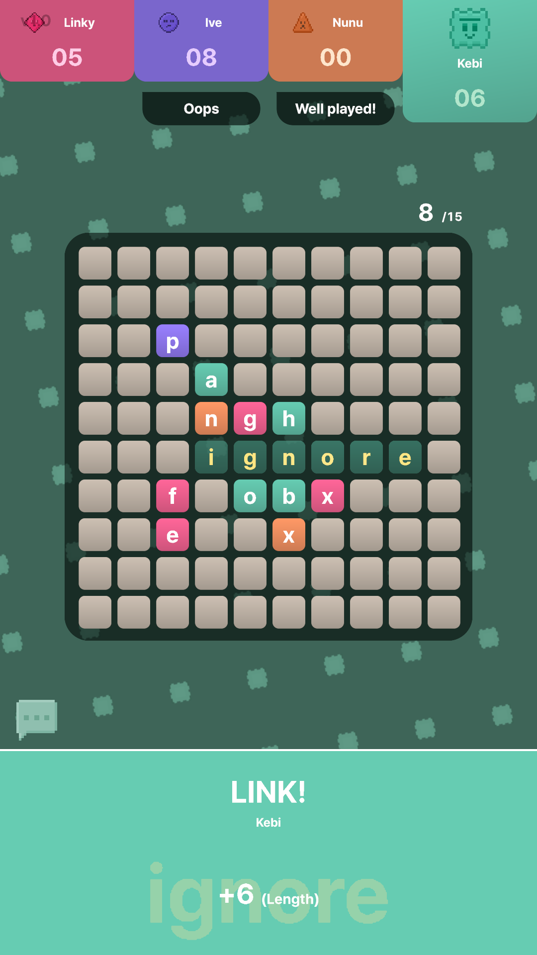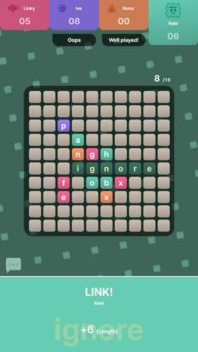 Link a word of four or more letters in a horizontal, vertical, or diagonal line, with both ends belonging to you, to score points!